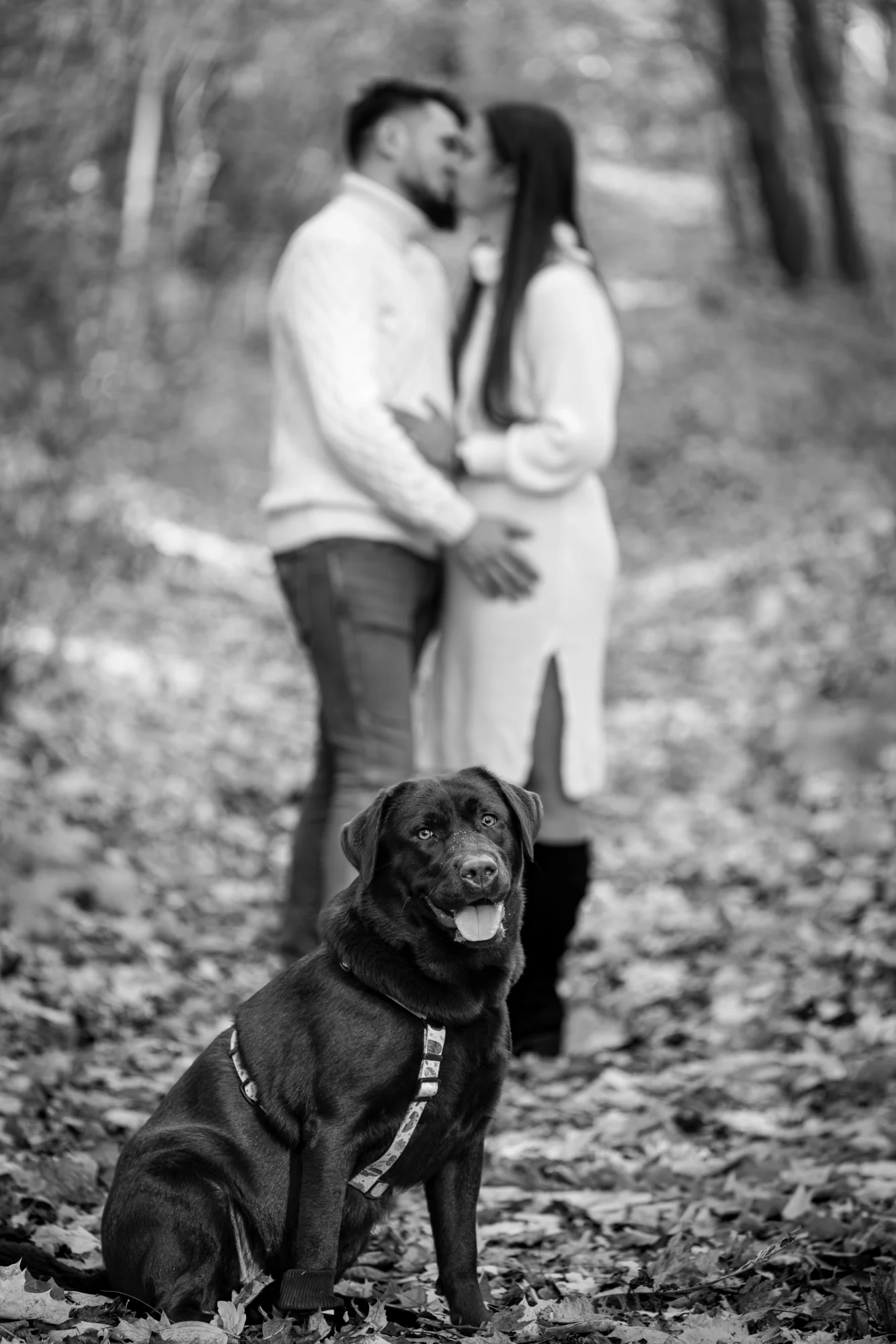 Od początku sesji jednym z głównych bohaterów była oczywiście Suzi – energiczna, czarna królowa spacerów. Już po kilku kadrach było jasne, że uwielbia pozować i być blisko swoich ludzi. To właśnie ta naturalność, spontaniczne spojrzenia i małe gesty między trójką bohaterów sprawiły, że sesja była pełna emocji i ciepła.